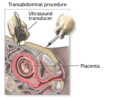 We generally do it transabdominally. A local anesthetic is injected into the skin. You will feel a needle stick when the anesthetic is injected. This may cause a brief stinging sensation. Then, ultrasound will be used to help guide a long, thin, hollow needle through your abdomen and into the uterus and placenta. This may be slightly painful, and you may feel a cramp as the needle enters the uterus. Tissue will be gently suctioned into a syringe. More than one sample may be needed to obtain enough tissue for testing. The needle will then be removed. An adhesive bandage will be placed over the abdominal needle insertion site.